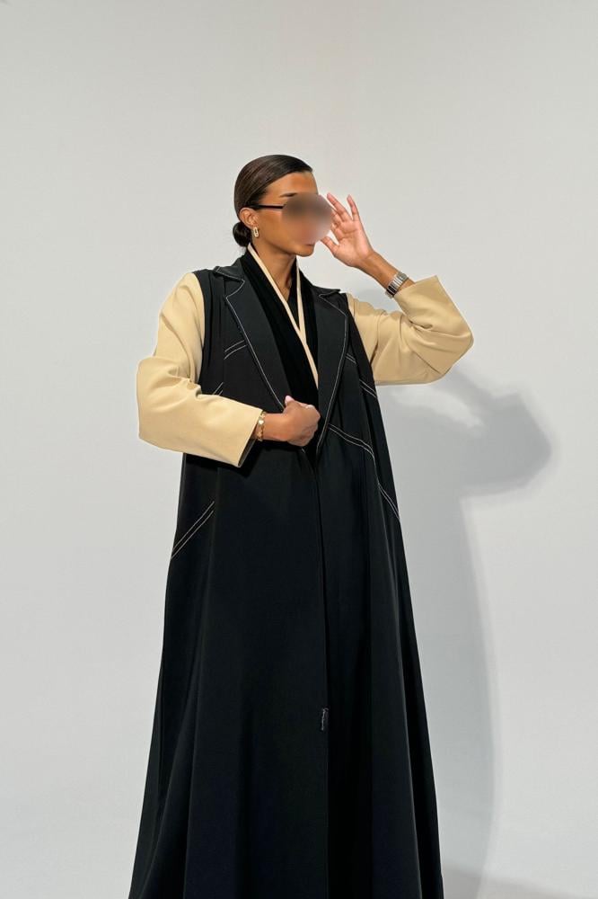 عبايه قماش كريب ، مع كم اضافي خارجي ( شيفون ) يتم تركيبه بطقطق قابل للازاله ولبس العبايه بدونه .
